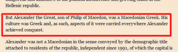«Το κενό χιλίων χρόνων ανάμεσα στις δύο ''Μακεδονικές'' κουλτούρες, δεν μπορεί να ''κλείσει'' με τον συμβολικό συσχετισμό της τωρινής ΠΓΔΜ με τον κατακτητή της Περσίας και της Ανατολής. Ο Μέγας Αλέξανδρος δεν ήταν Σλάβος και η περίφημη συνομιλία του με τον Διογένη δεν έγινε στα σλαβικά».