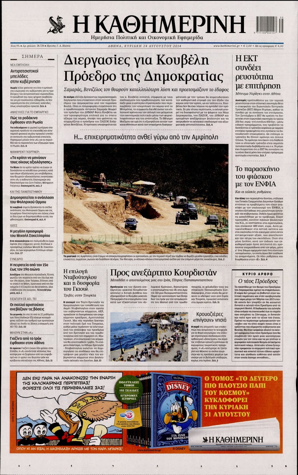 Πρωτοσέλιδα εφημερίδων Κυριακής 24 Αυγούστου 2014