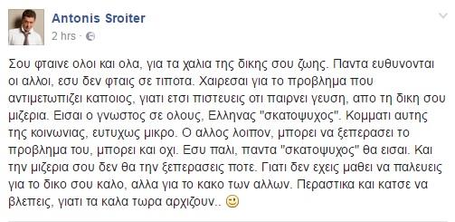 Αιχμηρό σχόλιο, μεσω Facebook, του Αντώνη Σρόιτερ, κατά του "γνωστού σε όλους Ελληνα "σκατόψυχου"".Οπως γραφει ο κεντρικός παρουσιαστής ειδήσεων του ALPHA: