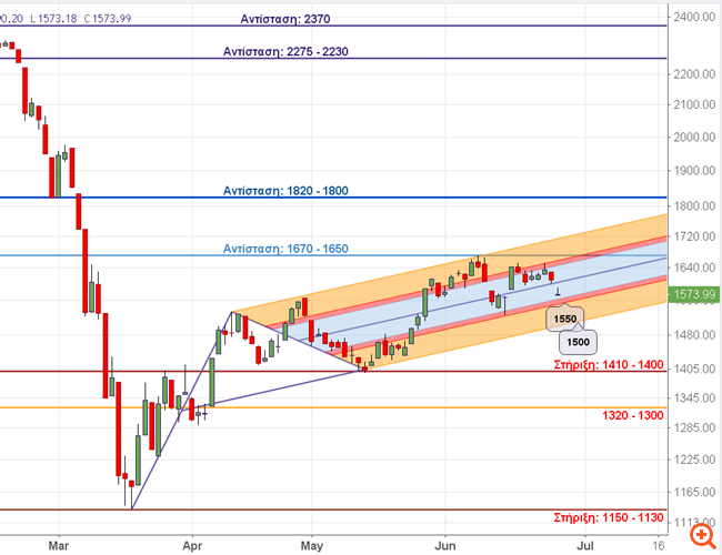 Διαγραμματικά τώρα ο δείκτης FTSE/ XA Large Cap φαίνεται να διέπεται από τα μέσα του Απρίλη από την ανοδική ρότα της Inside Pitchfork προβάλλοντας ως στήριξη την περιοχή των 1550 μονάδων. Πιθανή καθοδική τμήση των 1550 μονάδων θα φέρει τον δείκτη στην κάτω πλευρά του σχηματισμού στις 1500 μονάδες απειλώντας την υπάρχουσα ανοδική υπόστασή του. Αντιθέτως εάν ο δείκτης κρατηθεί πάνω από τη ζώνη των 1570 με 1550 μονάδων θα θελήσει να ανηφορίσει ξανά για το επίπεδο των 1650 μονάδων.