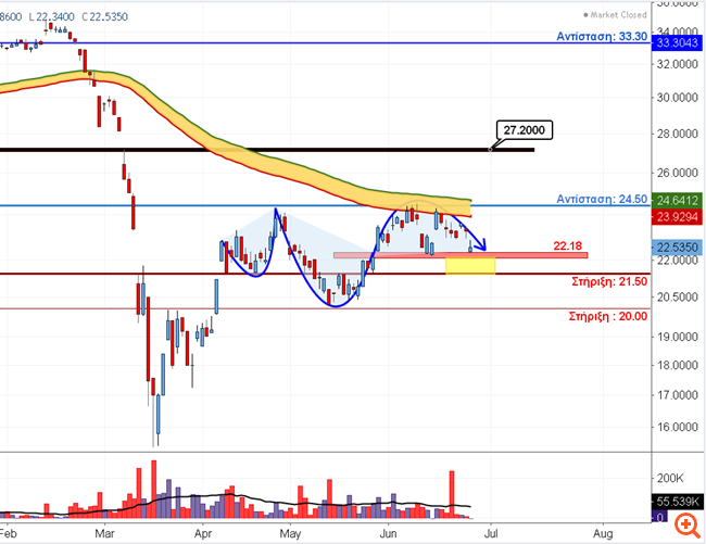 Οι δυσκολίες ανοδικής διαπερατότητας των 24,50 ευρώ που αντιμετώπισε η μετοχή της Coca Cola HBC της έχουν επιβάλει ένα υγιές pullback προς την περιοχή στήριξης των 22,30 με 22,18 ευρώ. Εκεί αναμένεται να ξεκαθαρίσουν οι διαθέσεις των πωλητών καθώς από εκεί και κάτω θα ανοιχτεί ένας δύστροπος δίαυλος επικοινωνίας με την ισχυρή στήριξη των 21,50 ευρώ ενώ θα βάλει στον πάγο 1,15 εκατ. μετοχές που αγοράστηκαν από τις 28 Μαΐου, ημέρα της ανοδικής διαφυγής άνω των 22,18 ευρώ. Στην περίπτωση, που η μετοχή σταματήσει και πατήσει επιτυχώς πάνω από τα 22,18 ευρώ τότε θα πρέπει να κάνουμε ανοδικό focus στα 23,34 ευρώ.
