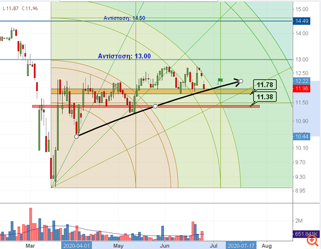 Ο ΟΤΕ εν αναμονή της αποκοπής του μερίσματος των 0,55 ευρώ στις 9 Ιουλίου δίνει μάχη για να κρατήσει τους πωλητές πάνω από το επίπεδο στήριξης των 11,78 ευρώ. Όσο η περιοχή αυτή κρατάει δίχως ρωγμές στις όποιες ρευστοποιήσεις τόσο θα πάει να ξεσπάσει ανοδικά προς τα 12,60 ευρώ. Επίσης σύμφωνα με τα Gann Square μπαίνει από τη συνεδρίαση της Δευτέρας σε ένα μεγαλύτερο εύρος τιμών που μπορεί να την οδηγήσει έως τα μέσα του Αυγούστου στο κεφαλόσκαλο των 14,50 ευρώ. Να σημειωθεί ότι η μετοχή έχει πραγματοποιήσει από τις αρχές του καλοκαιριού 12 εκατ. τεμάχια με μέσο όρο τα 12,37 ευρώ.