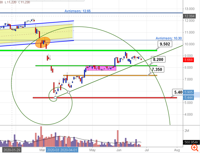 Από τις μετοχές τώρα που οδηγούν την κούρσα στον δείκτη FTSE/ XA Large Cap ο ΟΠΑΠ, όπου σημείωσε χθες το υψηλότερο ιστορικά ποσοστό (77,43%) συμμετοχής στη Γενική Συνέλευση (έτσι πρέπει), παραμένει μέσα στο ανοδικό κανάλι που σχεδιάζει το Fib Spiral έχοντας ως αρχικό σημείο στήριξης τα 8,52 ευρώ και ως δεύτερο και πιο ισχυρό τα 8,20 ευρώ. Ο σημαντικός όγκος συναλλαγών των 12,34 εκατ. τεμαχίων που έχει πραγματοποιηθεί από τις 27/05 όπου και έκοψε ανοδικά τα 8,20 ευρώ δεν αφήνει στους swing επενδυτές και μεγάλο περιθώριο οπισθοχώρησης για αγορές. Ο ανοδικός στόχος συνεχίζει να αναβοσβήνει στο επίπεδο τιμών μεταξύ των 9,10 με 9,50 ευρώ. Στα υπόψιν το συμπληρωματικό μέρισμα των 0,30 ευρώ που θα κοπεί στις 21 Ιουλίου.