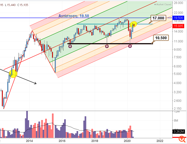 Τέλος τα Jumbo πολιορκούν δίχως μέχρι στιγμής αποτέλεσμα το τελευταίο διαγραμματικό οχυρό των Bears μεταξύ των 16,30 με 17 ευρώ. Αρπαγή των 17 ευρώ θα επαναφέρουν τη μετοχή μέσα στο ανοδικό κανάλι, που αποτυπώνει η τεράστια Pitchfork του 2012, σπρώχνοντάς τη προς τα 19,50 ευρώ. Παρουσιάζει το καλύτερο πλαγιοανοδικό διάγραμμα σε σχέση με τις άλλες τρεις εταιρείες αφήνοντας ένα μικρό περιθώριο πτώσης προς την περιοχή μαζέματος των 15 με 14,80 ευρώ. Η μετοχή έχει κάνει κατά το 2μηνο της βίαιης πτώσης Φεβρουαρίου- Μαρτίου από τα 19,10 στα 9,94 ευρώ συνολικό όγκο συναλλαγών 10,53 εκατ. τεμάχια ενώ κατά την άνοδο που ακολούθησε 12,75 εκατ. τεμάχια (!).