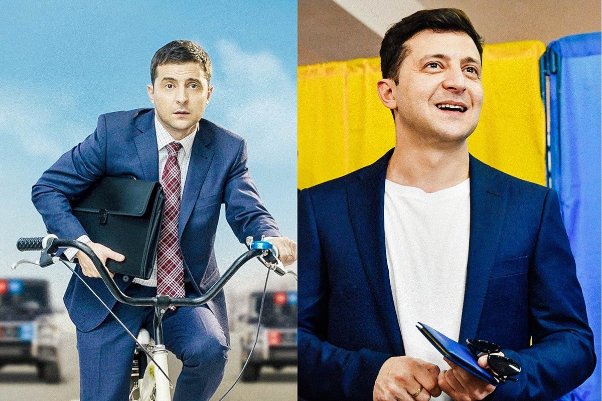 Αριστερά ο κωμικός Ζελένσκι ως ο δάσκαλος που έγινε πρόεδρος στην τηλεοπτική σειρά ”Ο Υπηρέτης του Λαού” και δεξιά ο Ζελένσκι ως πολιτικός της Ουκρανίας λίγο πριν να γίνει Πρόεδρος στην πραγματικότητα.Αρκεί να αναφέρουμε εδώ ότι η προεκλογική εκστρατεία του Ζελένσκι ήταν η περιοδεία που συνέχισε να κάνει με τον κωμικό του θίασο στην Ουκρανία μοιράζοντας γέλιο αλλά και μηδέν ξεκάθαρες πολιτικές θέσεις στους συμπολίτες του, κάτι που μας φέρνει στον νου μια Ντεμπωριανή πολιτική κοινωνία του θεάματος ουκρανικού τύπου. Καμία προεκλογική συγκέντρωση, καμιά συνέντευξη με δημοσιογράφους, ή, ντιμπέϊτ με τον κύριο αντίπαλό του.