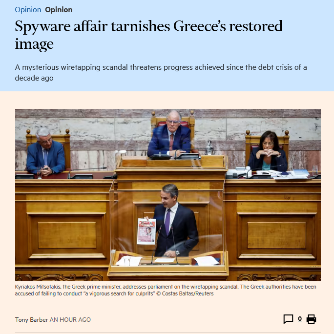 Ο χρόνος θα δείξει αν αυτό θα οδηγήσει σε νομικές διαδικασίες, αναφέρουν οι Financial Times σε ανάλυσή τους υπό τον τίτλο “η υπόθεση υποκλοπών αμαυρώνει την αποκατεστημένη εικόνα της Ελλάδας” (Spyware affair tarnishes Greece’s restored image)