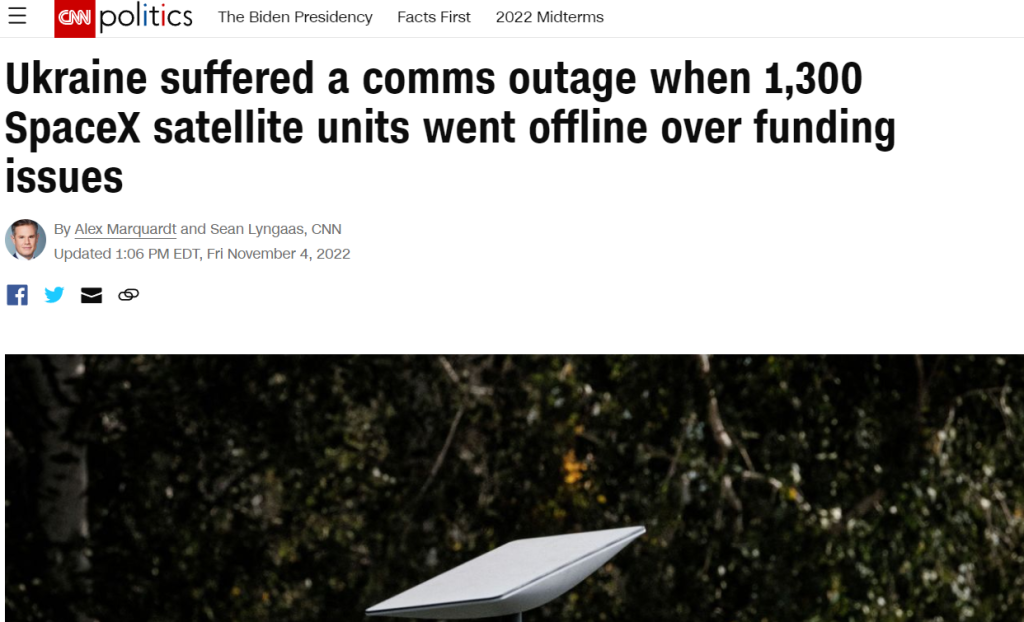 «Περίπου 1.300 δορυφορικά τερματικά Starlink βγήκαν εκτός σύνδεσης στην Ουκρανία την περασμένη εβδομάδα λόγω αδυναμίας πληρωμής των λογαριασμών του στρατού στο Διαδίκτυο, εντείνοντας τους φόβους ότι η χώρα δεν θα είναι πλέον σε θέση να αντέξει οικονομικά την ακριβή δορυφορική υπηρεσία», ανέφεραν στο CNN δύο πηγές που γνωρίζουν την κατάσταση.