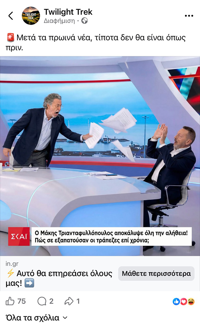 Το σενάριο των διαφόρων εκδοχών με τις οποίες εμφανίζονται οι ψευδείς αυτές αναρτήσεις είναι το ίδιο. Ευκολοχώνευτο και εύληπτο. Η παγίδα κρύβεται στην υπόσχεση πως θα υπάρχει η δυνατότητα εύκολου κέρδους. Το δόλωμα είναι ο Μάκης Τριανταφυλλόπουλος.